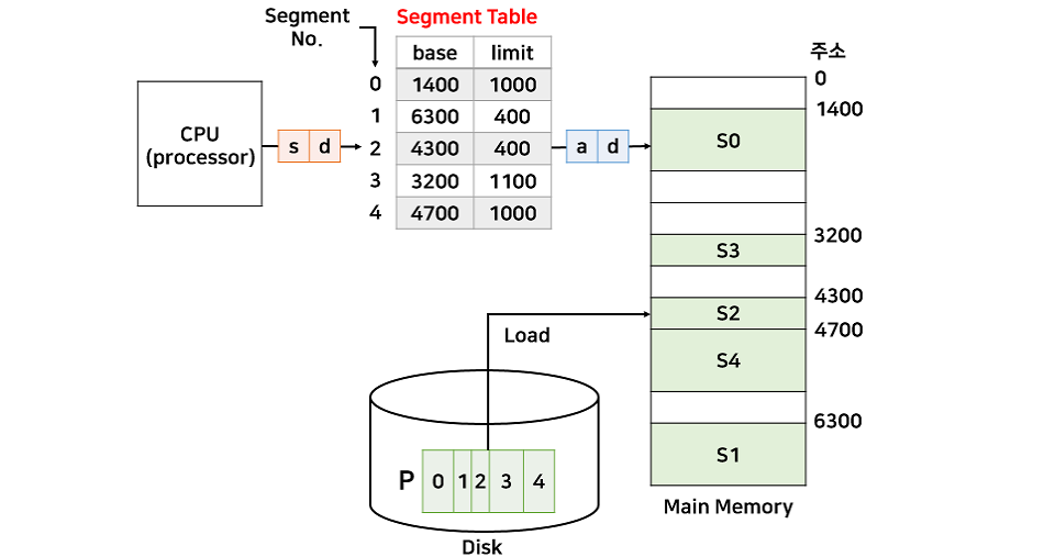 세그멘테이션을 위한 세그먼트 테이블이 존재합니다. 세그먼트 테이블은 번호와 시작주소, 세그먼트 크기를 엔트리로 갖습니다.