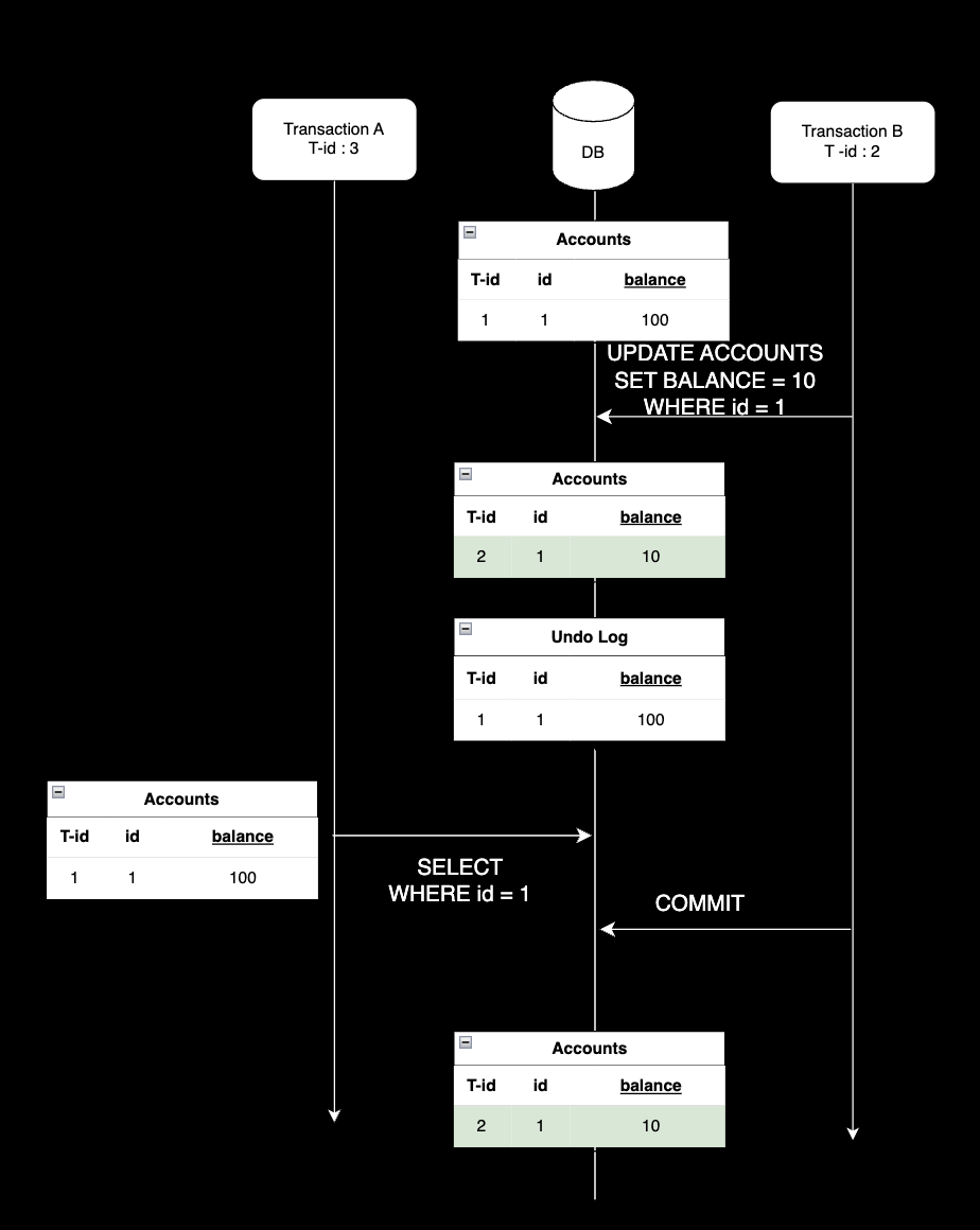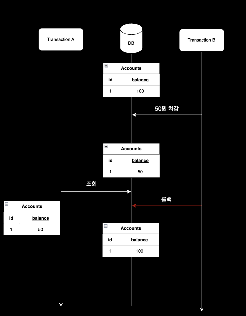 3. 트랜잭션 B가 롤백하면 잔고는 다시 100으로 돌아감