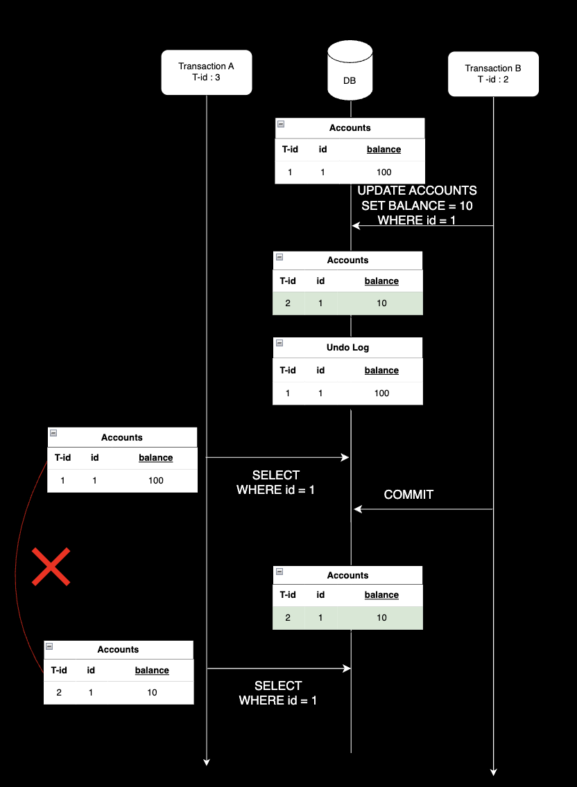 4. 하지만 트랜잭션 A는 그 사이를 모르기에 잘못된 정보로 데이터를 처리함.